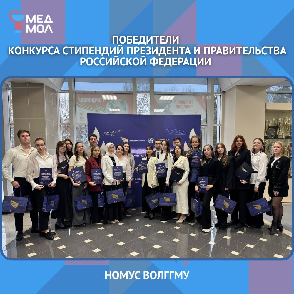 Члены научного общества молодых ученых и студентов ВолгГМУ одержали победу в престижнейшем конкурсе на получение стипендии Президента и Правительства Российской Федерации. По итогам всероссийского отбора 12 наших ребят были признаны одними из лучших в стране!